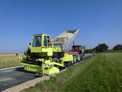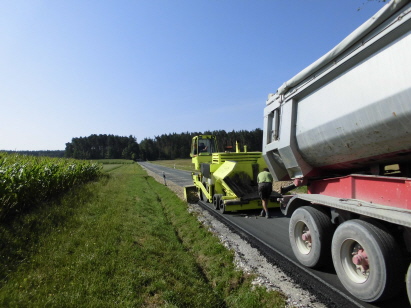 Bankettfertiger maschinell über Längs- und Querbänder zur Bohle "Auswurf" hin befördert.